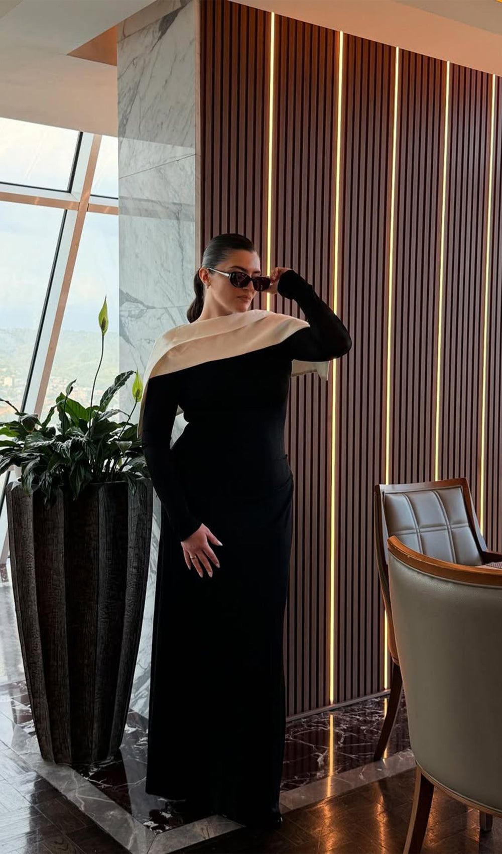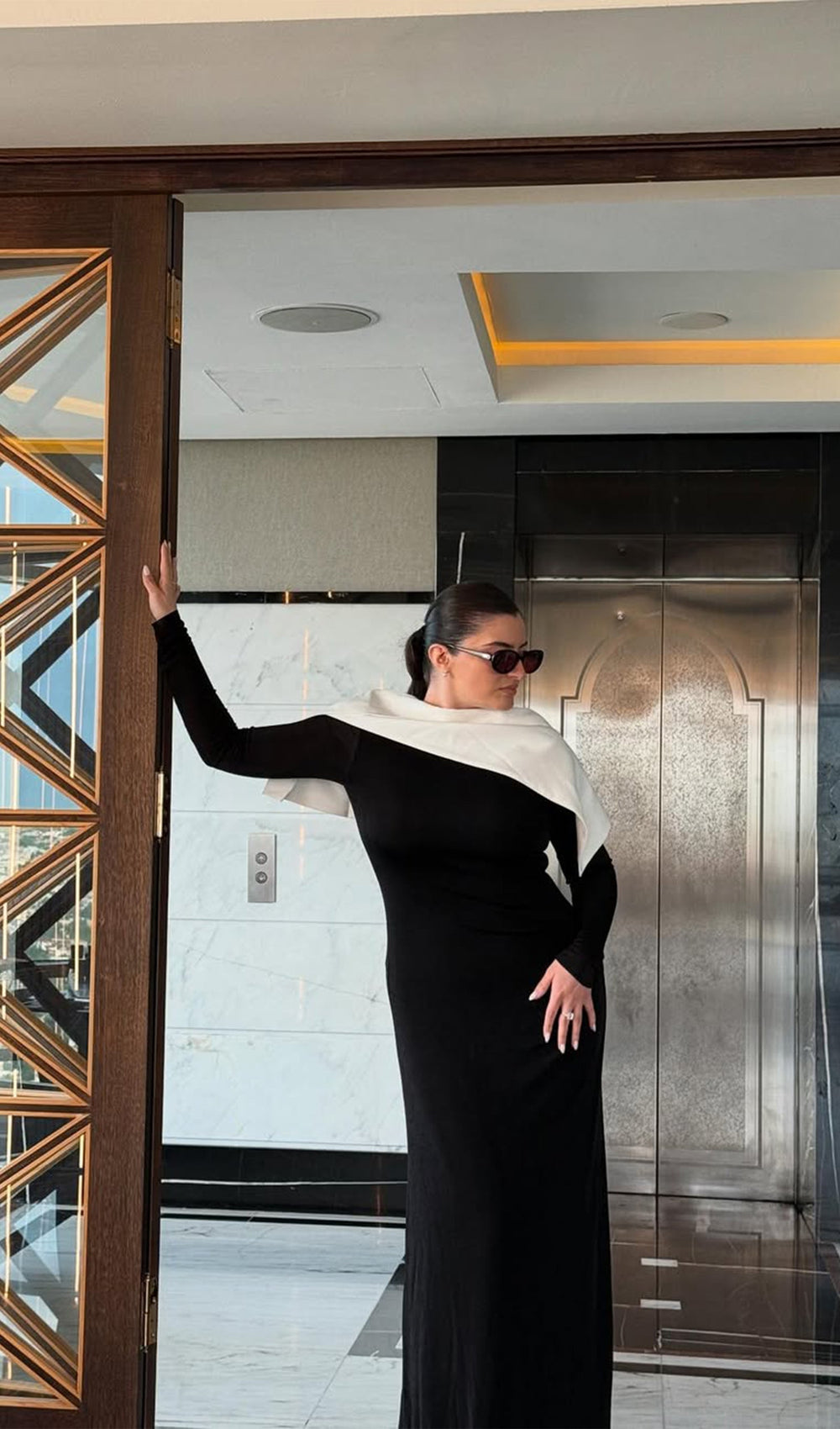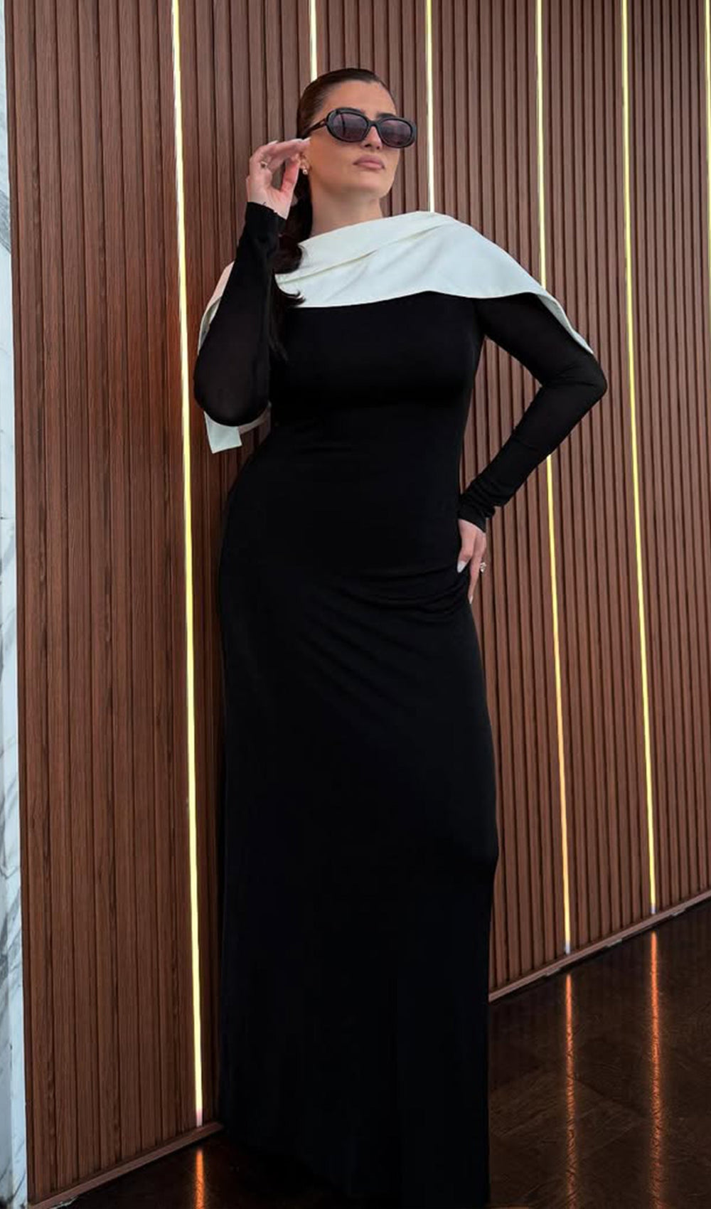 This maxi dress features an asymmetrical draped shoulder and pleated design, creating a unique and elegant look. Its flowy silhouette and soft fabric provide comfort and easy movement, making it perfect for any special occasion.