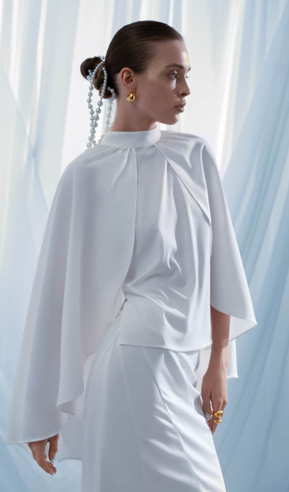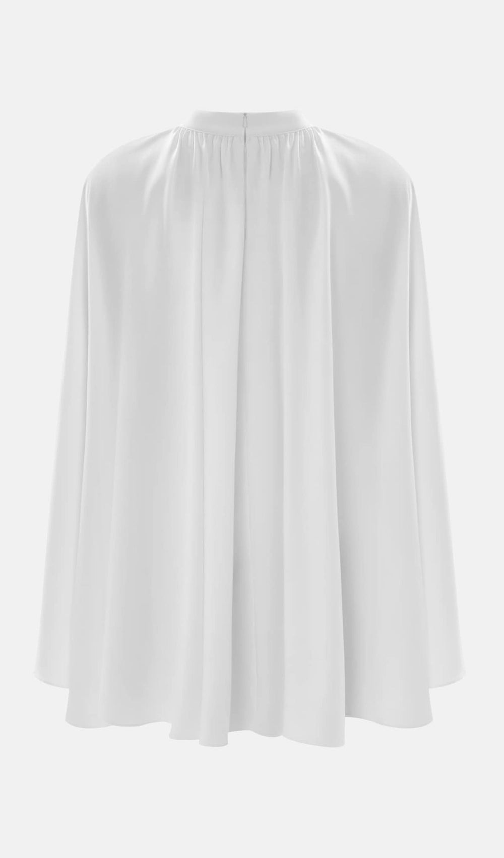 Demure blouse of an original design with a straight top with a high stand collar and a voluminous flared cape with large pleats on the shoulders. The model is made from dense fabric with a delicate sheen and forms a set with the matching maxi skirt.