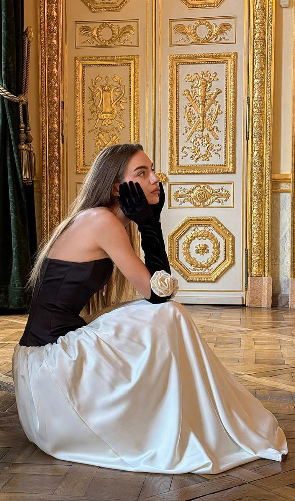 Spectacular maxi dress with a corset bodice made from dense fabric, emphasizing the figure and gracefully revealing the shoulders, along with a flowing satin floor-length skirt with small gathers at the waist.