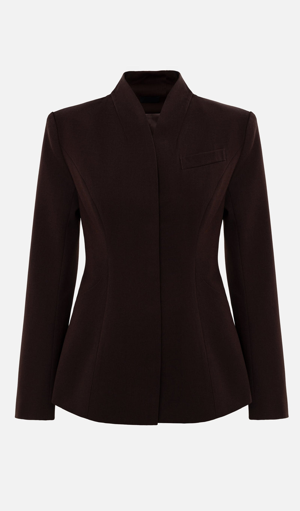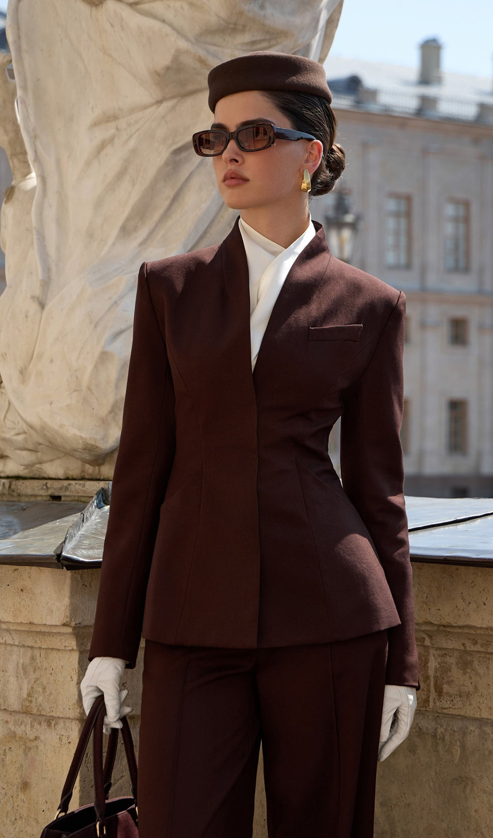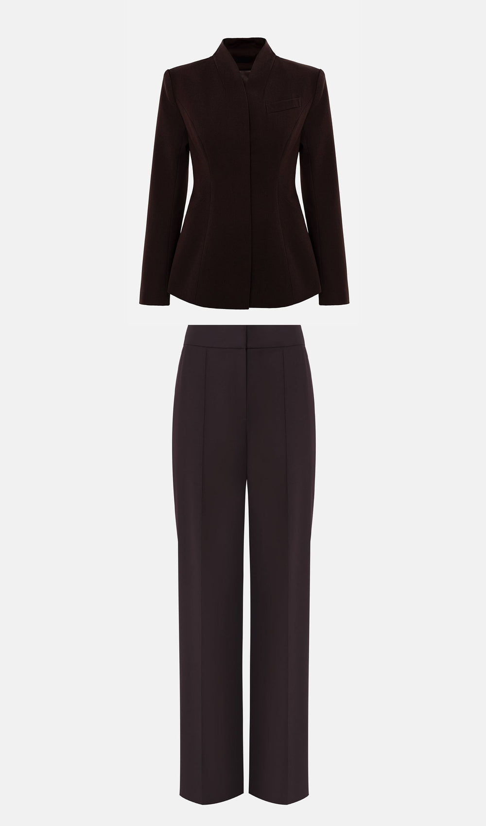 Demure single-breasted fitted jacket with a high stand-up collar and vertical raised darts sculpting the silhouette, along with straight sleeves and concealed fastening. Loose, full-length trousers with a high waistline and graphic creases at the front. Pair them with the matching fitted jacket to create a set.