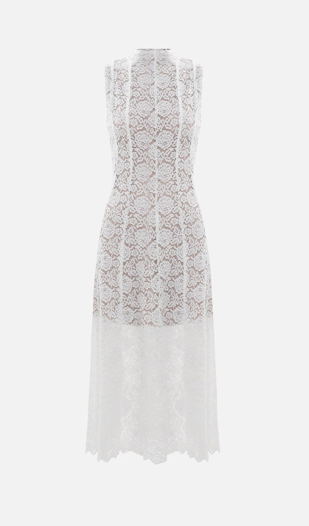 Exquisite midi dress with a high full-cut collar and fitted sleeveless bodice, along with a flared skirt with openwork bottom edge. The model is made from semi-transparent lightweight guipure with a dense lining and is finished with a multitude of vertical raised darts sculpting the silhouette.