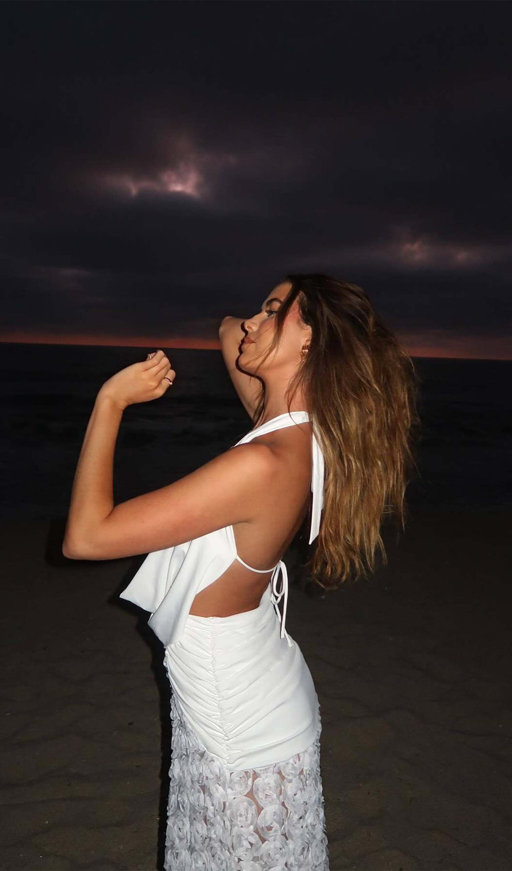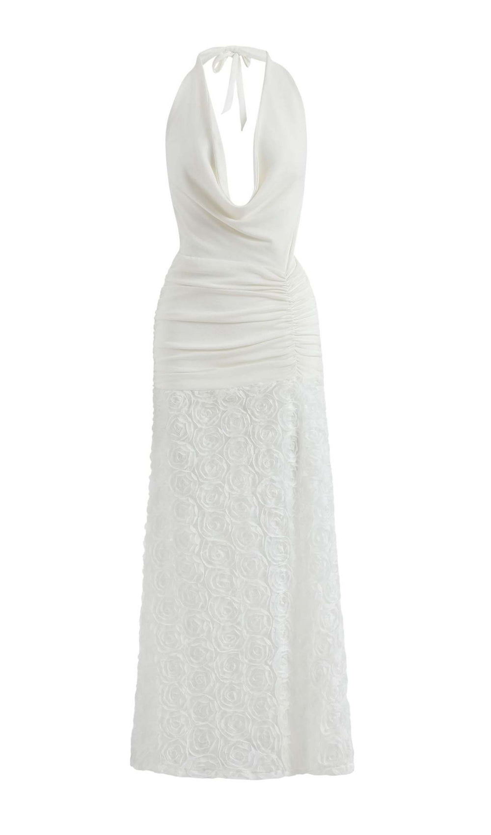Elevate your evening allure with the Textured Maxi Dress. Featuring a dramatic deep cowl open neckline, ruched panel at the waist, and a captivating open back, it's designed for those who revel in the magic of moonlit nights and twilight's embrace.