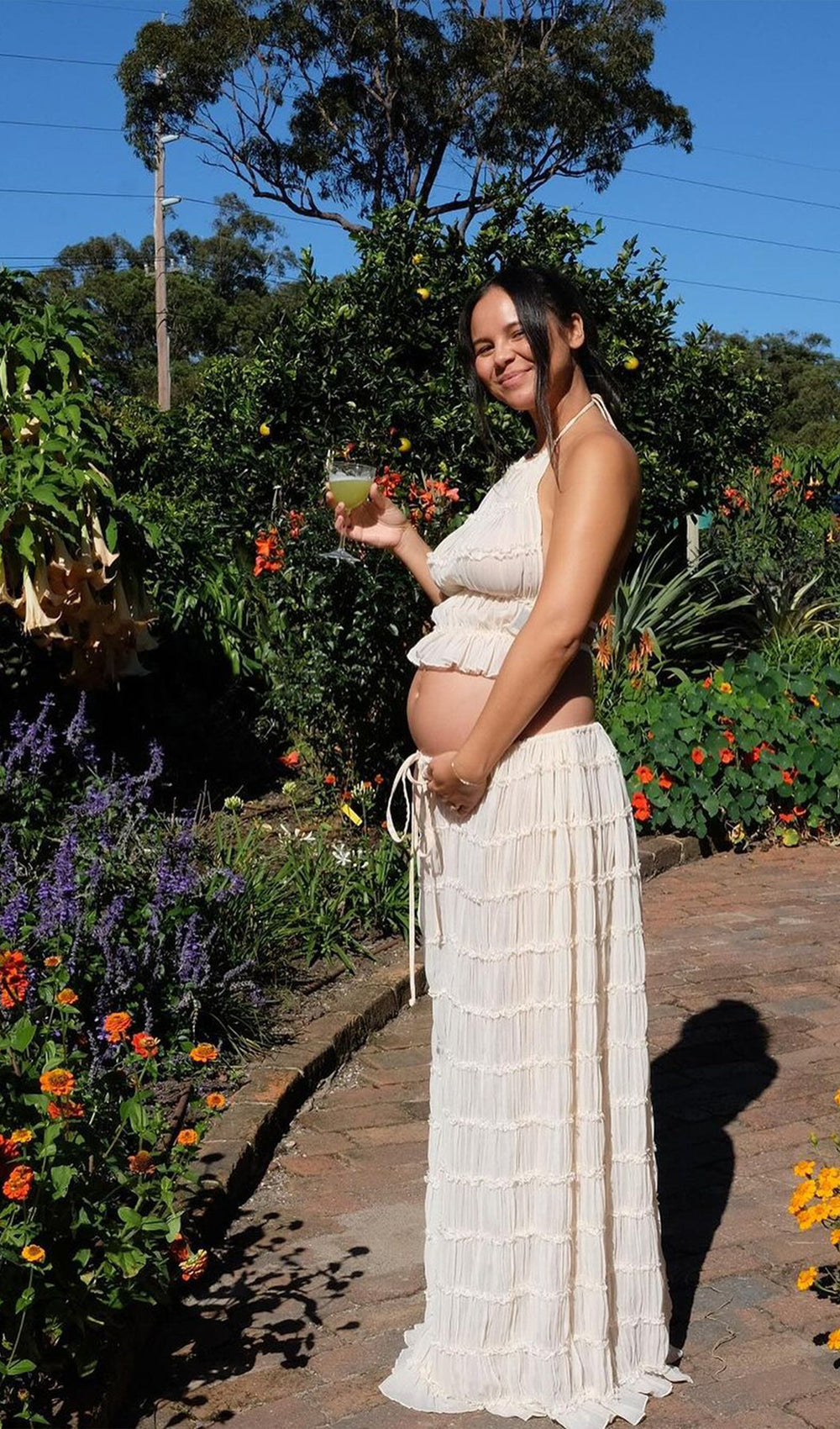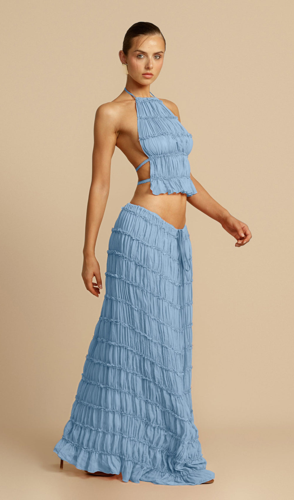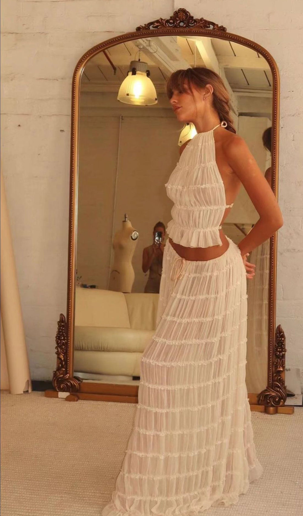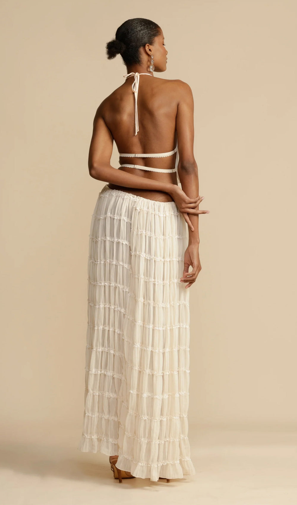 The skirt, a seamless blend of versatility and vintage charm. Featuring a voluminous maxi skirt with ruched detail and delicately piped lace. It is a fashion-forward essential, her drawstring waist allows you to wear her as a skirt, or make a flattering flowing dress with a sweeping low back.