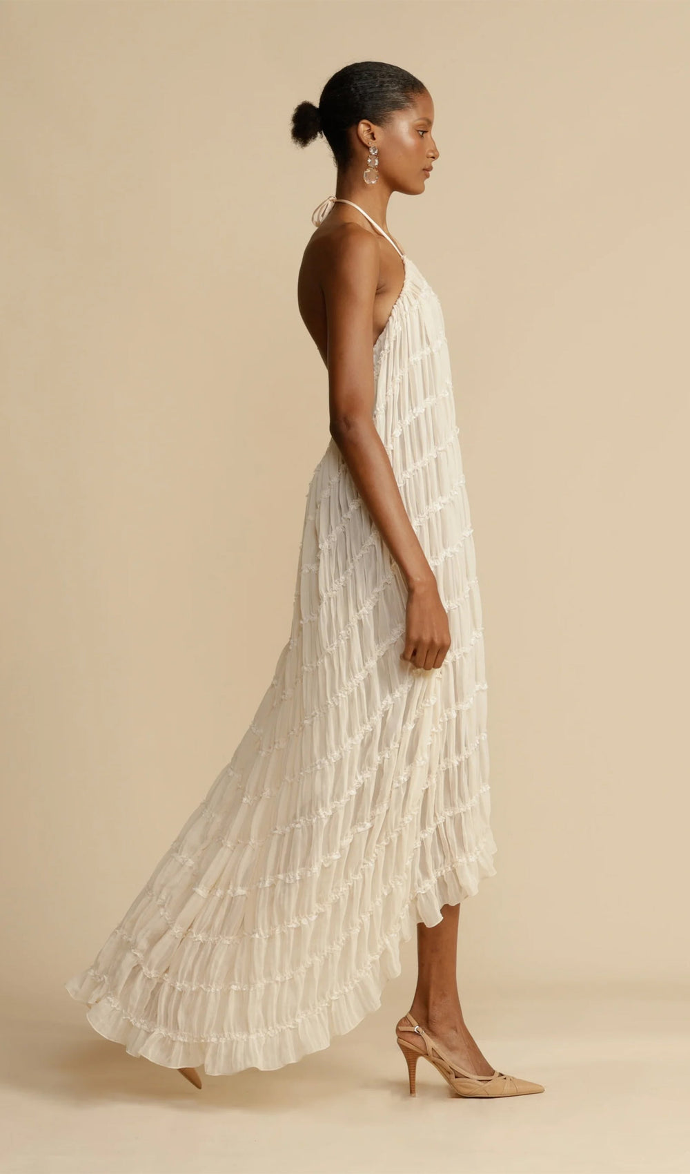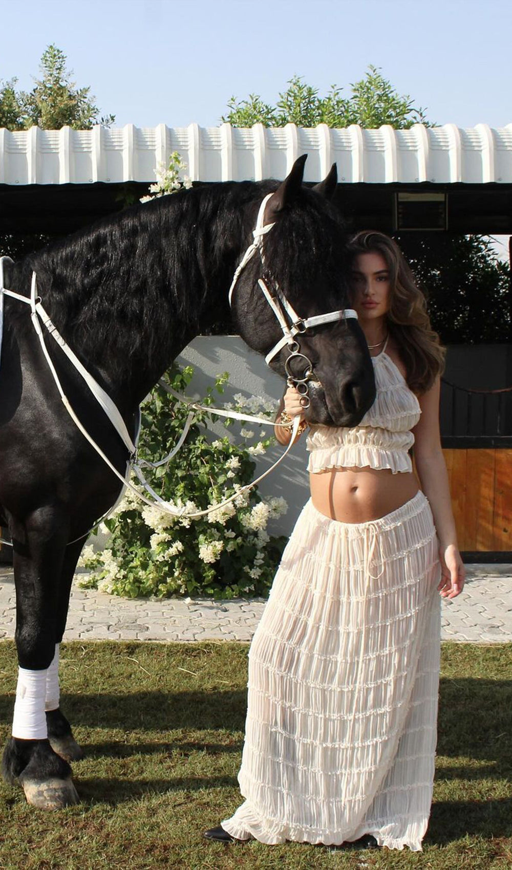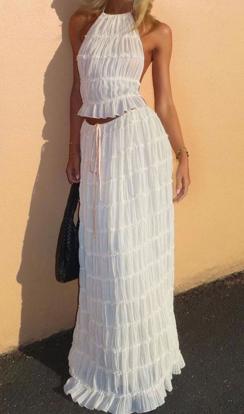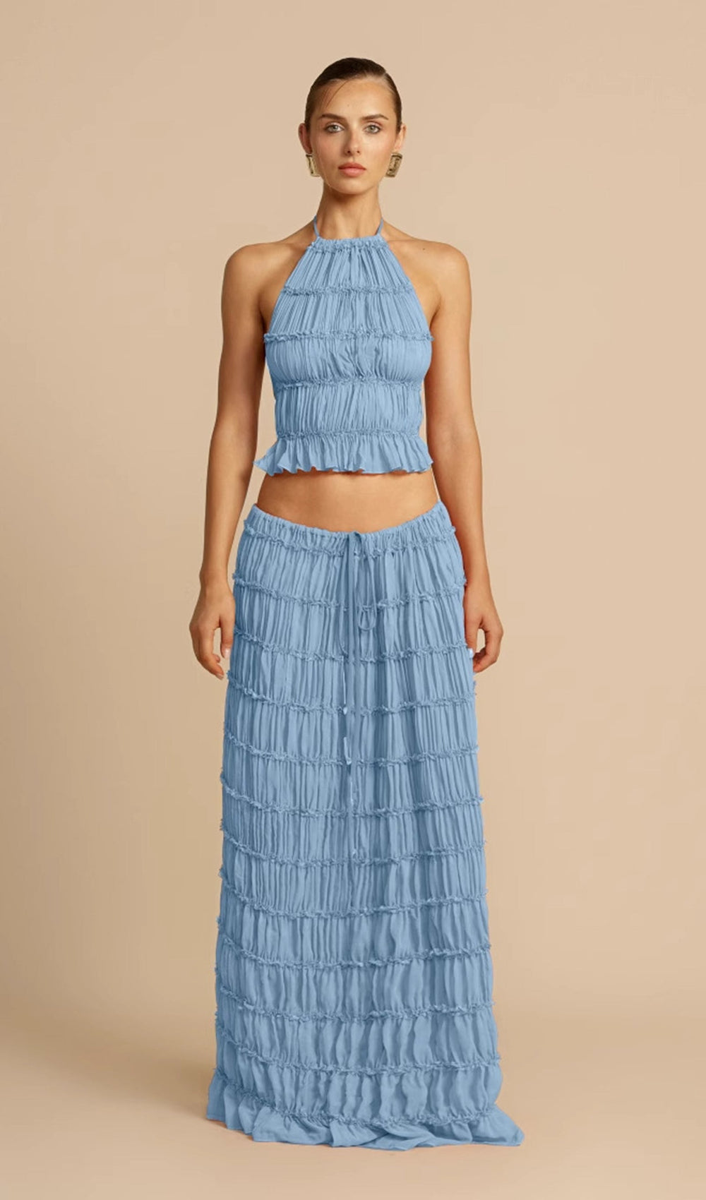 The skirt, a seamless blend of versatility and vintage charm. Featuring a voluminous maxi skirt with ruched detail and delicately piped lace. It is a fashion-forward essential, her drawstring waist allows you to wear her as a skirt, or make a flattering flowing dress with a sweeping low back.