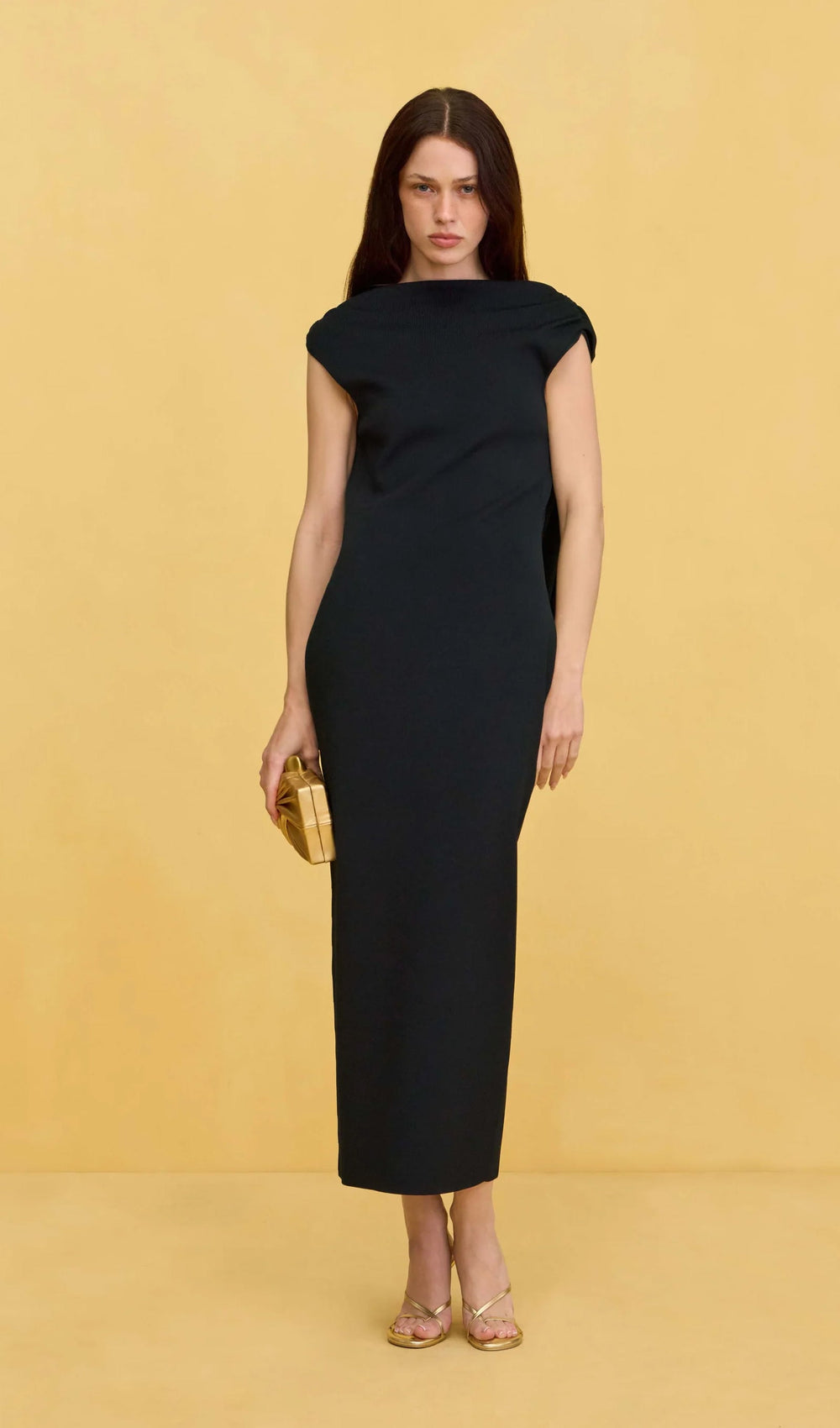 Knit Deep Cowl Back Midi Dress This sophisticated knit midi dress is distinguished by a striking cowl back, enhanced with two pleated gold-tone embellishments.