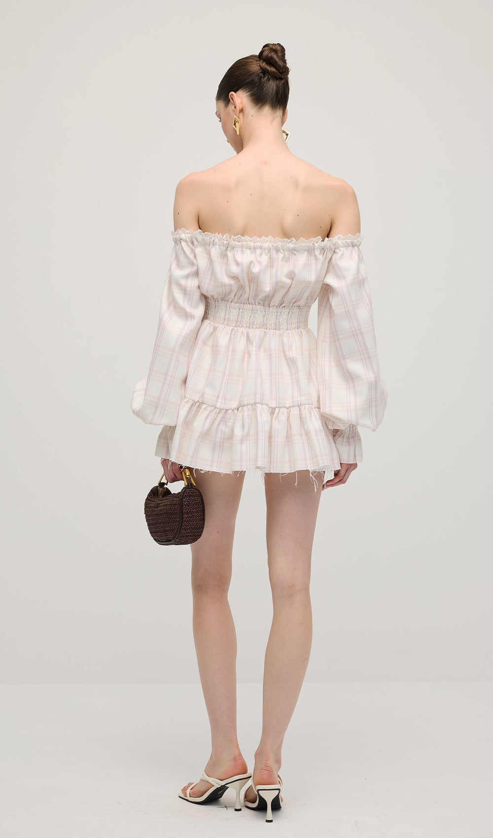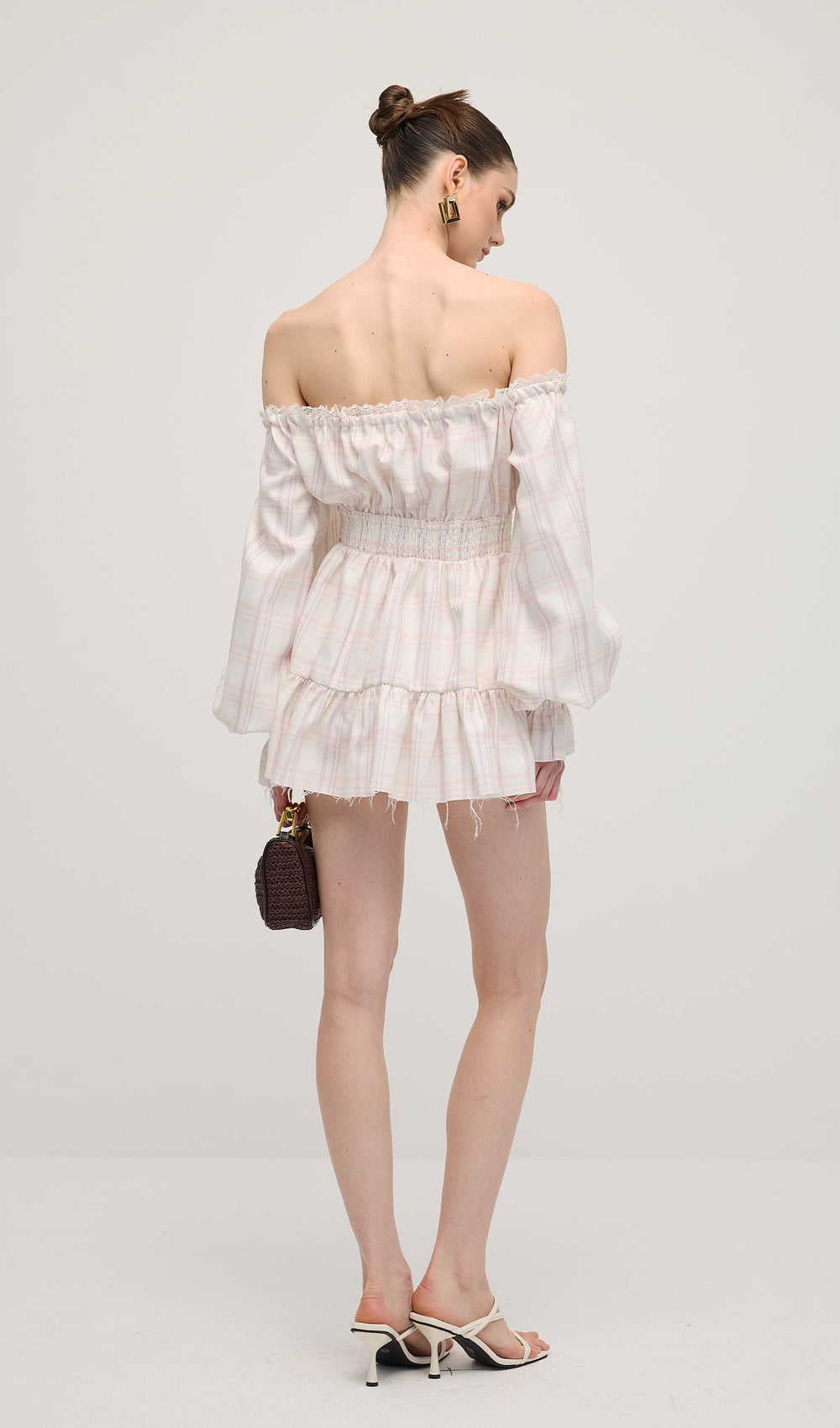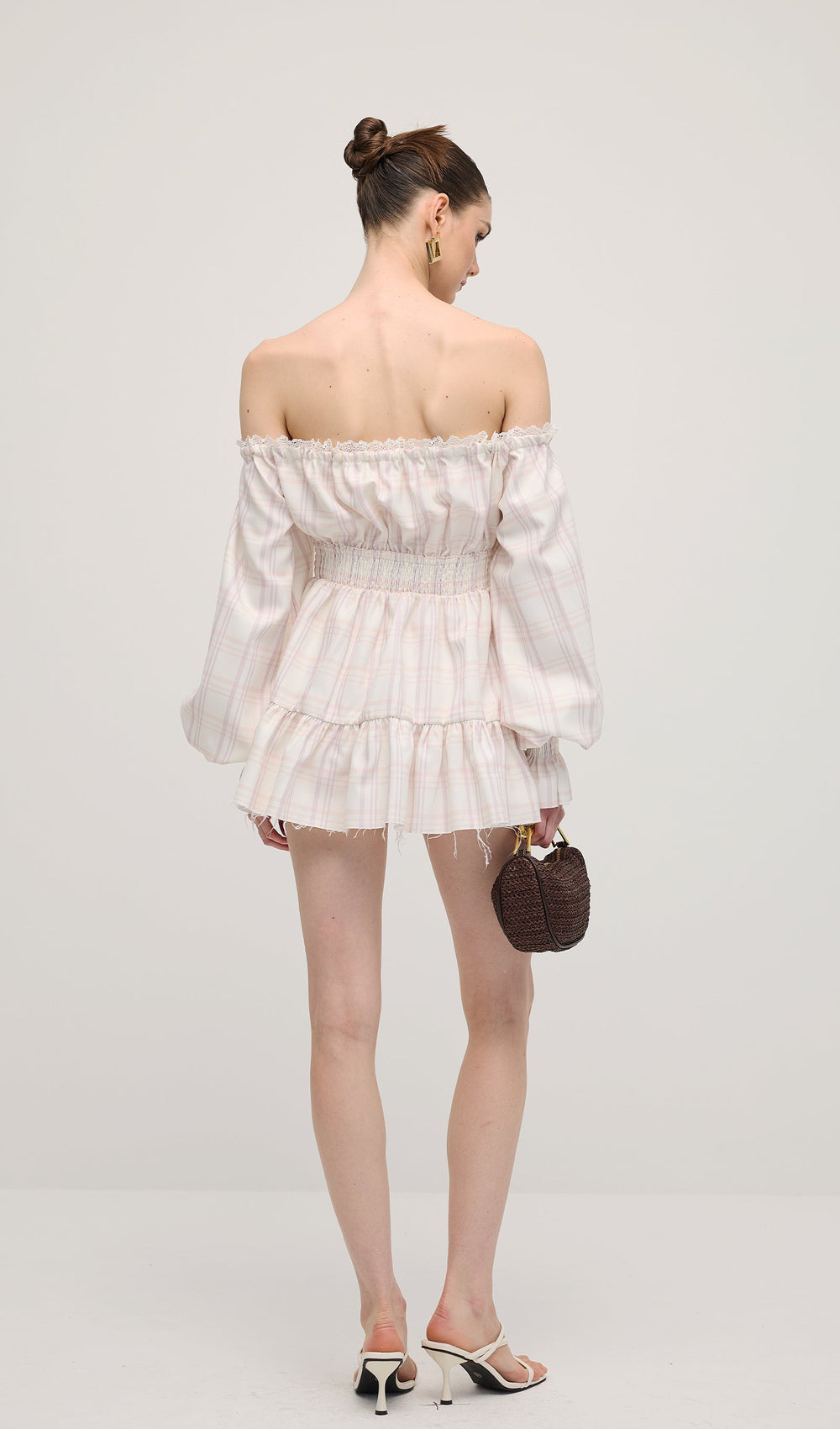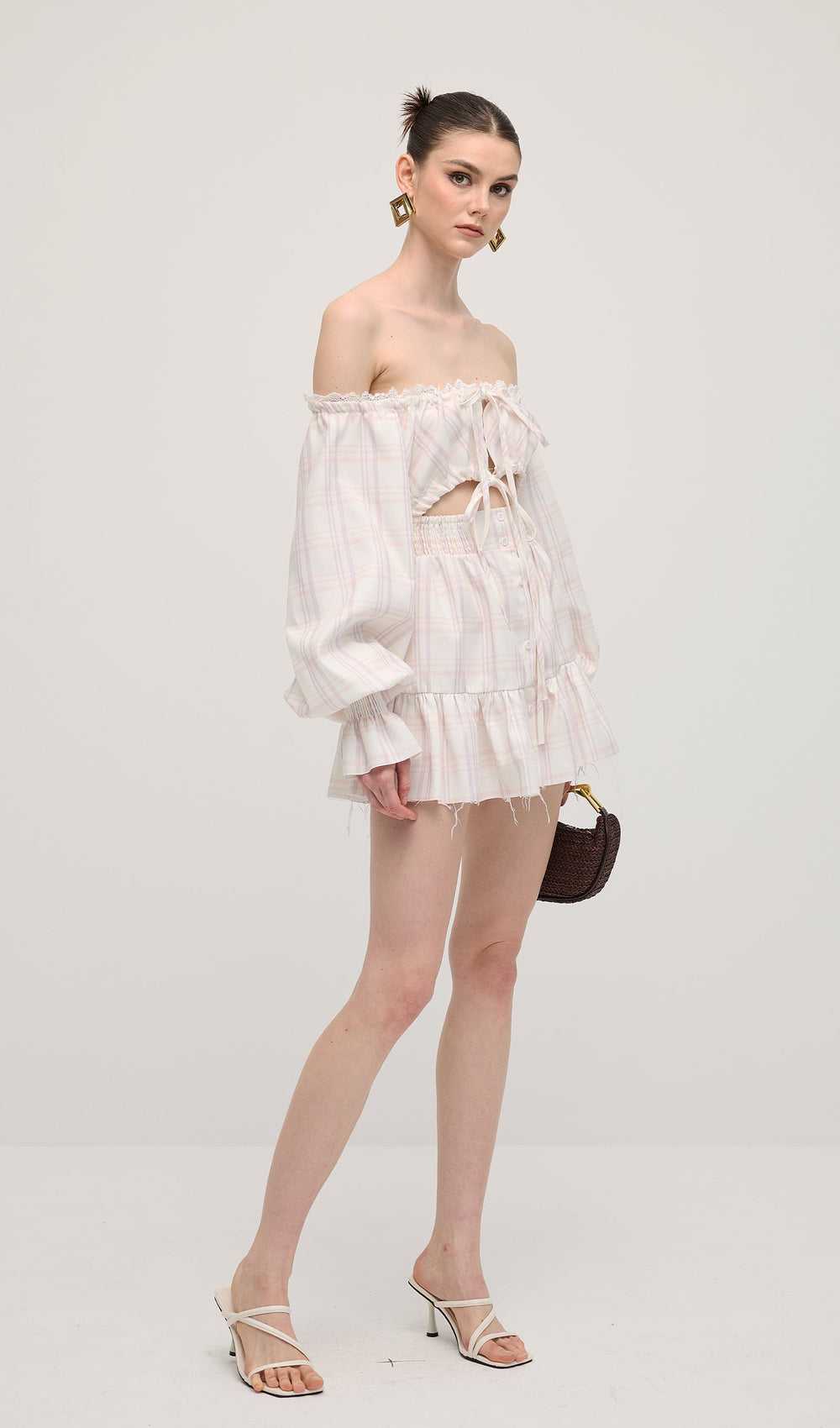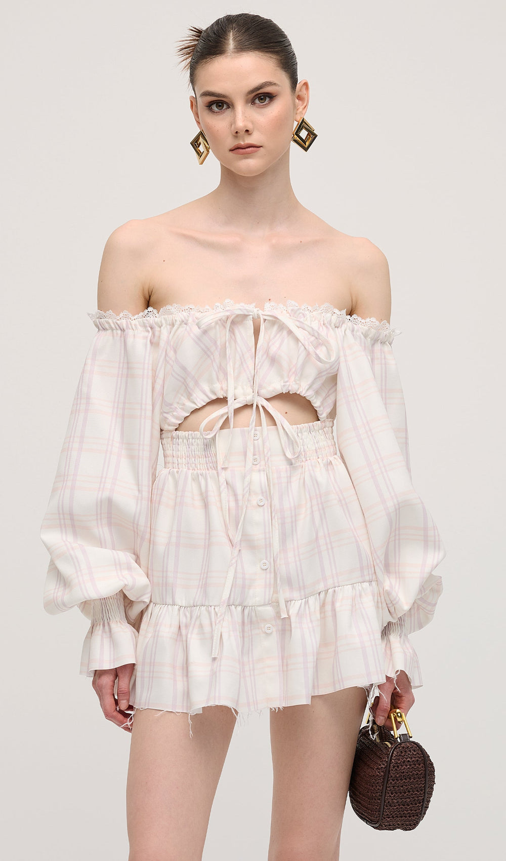 This Lace Up Mini Dress Two Piece Set features a trendy lace-up design with flattering puff sleeves and delicate ruffle detailing. Perfect for any occasion.