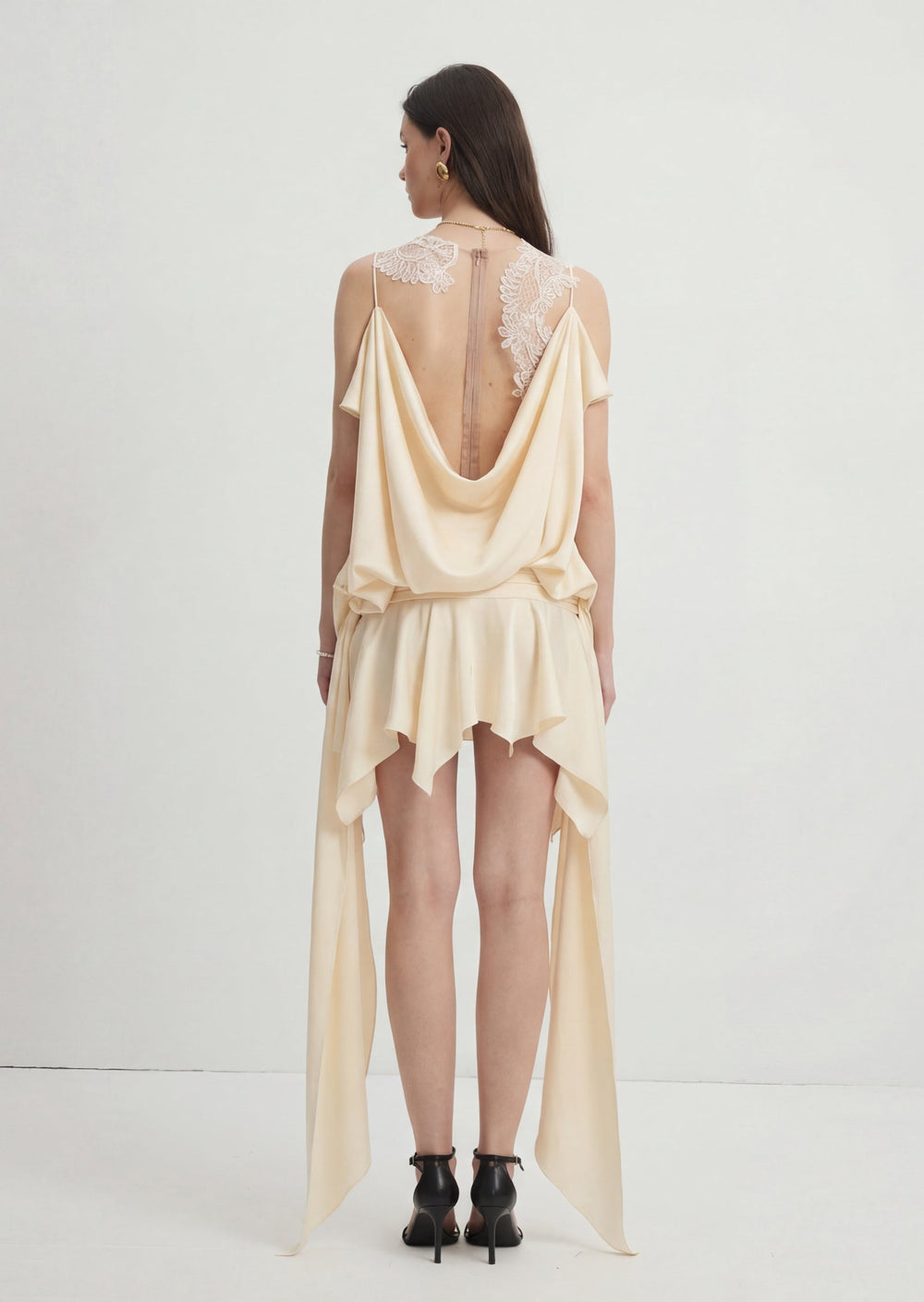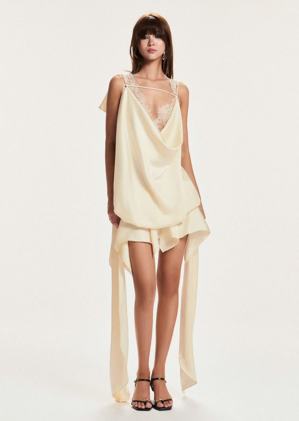 The outer layer is made of premium Suzhou silk, soft, cool, and flowing, with a deep V-neckline both front and back, subtly revealing the lace bodysuit underneath. The shoulder straps are adjustable, and the asymmetrical skirt features a rounded cut with a unique, flowing zigzag hem. The "chubby" silhouette effectively conceals imperfections around the waist, while the alluringly deep back accentuates the body's curves.