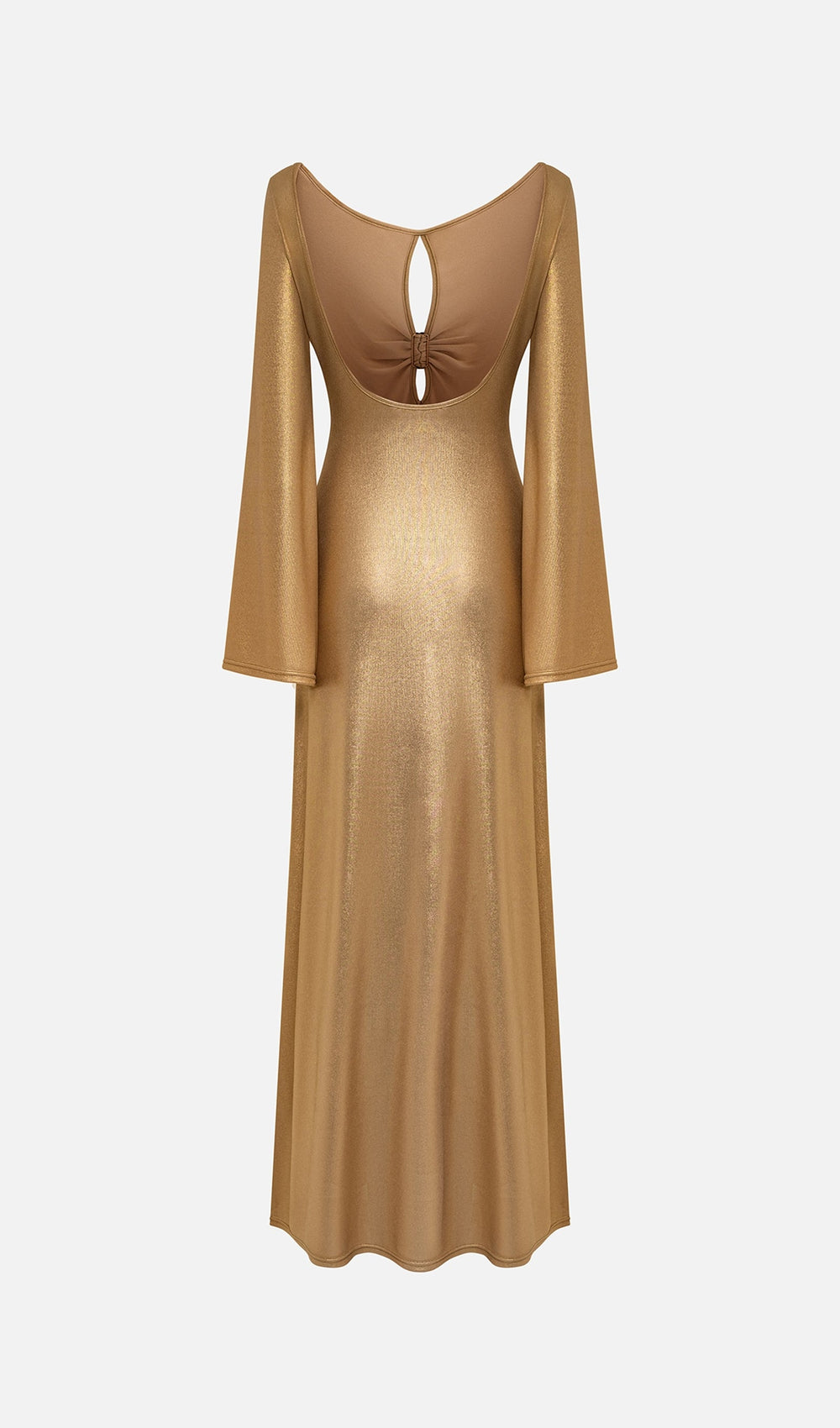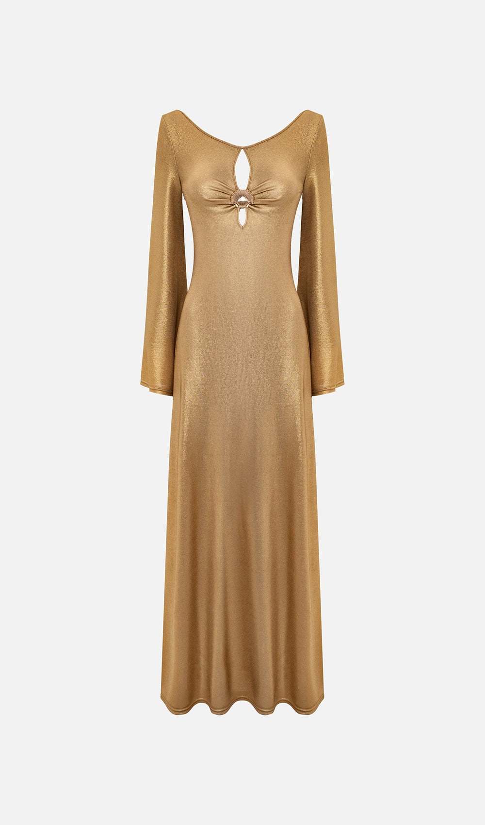 Exquisite fitted maxi dress made from stretch jersey with metallic shine. The model features a spectacular vertical slit on the bodice, decorated with a golden metallic element, along with flared long sleeves and a floor-length skirt with a tight fit on the hips.