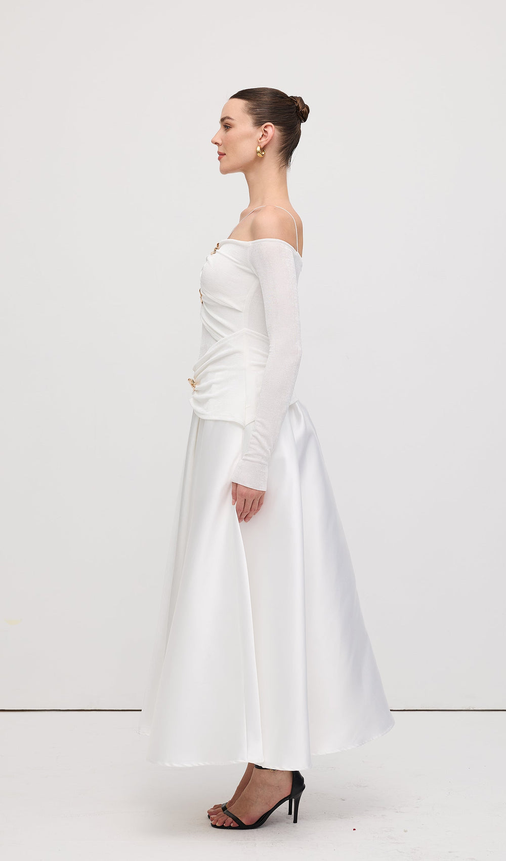 Elevate your evening attire with this sophisticated Off Shoulder Panelled Maxi Dress. The strategic panelling creates a flattering silhouette while the off-shoulder design adds a touch of elegance. Crafted with premium fabric that ensures comfort throughout extended wear, this maxi length dress transitions seamlessly from formal events to upscale dining occasions.