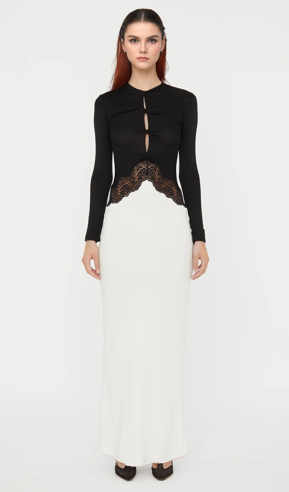 Pragmatic & feminine details combine to form this lace insert long sleeve maxi dress. Fine rib stretches with ease to the body, whilst sheer lace traces the torso. Twist cut out details draw the eye in.