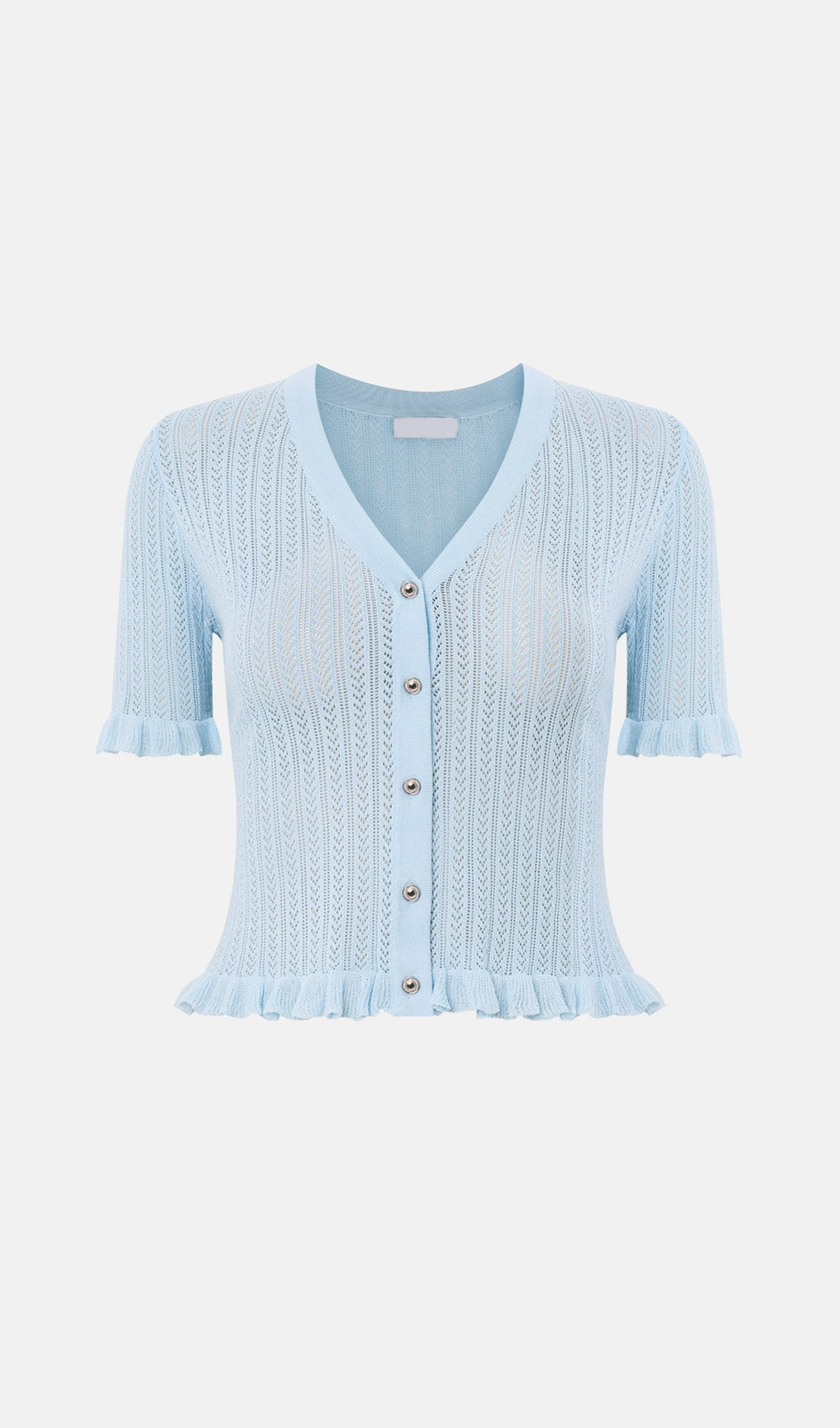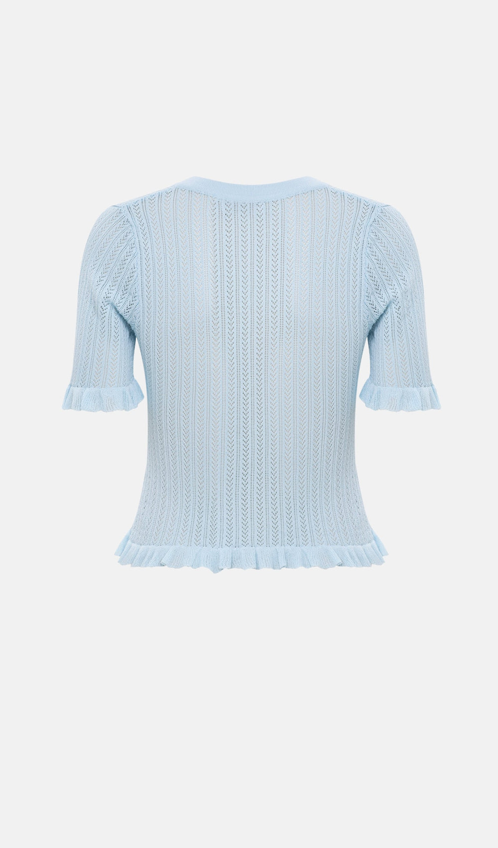 Straight high-waisted maxi skirt with an elasticated waistband, made from soft jersey with openwork inserts and a delicate ruffle at the bottom edge. Pair it with the matching top to create a set.