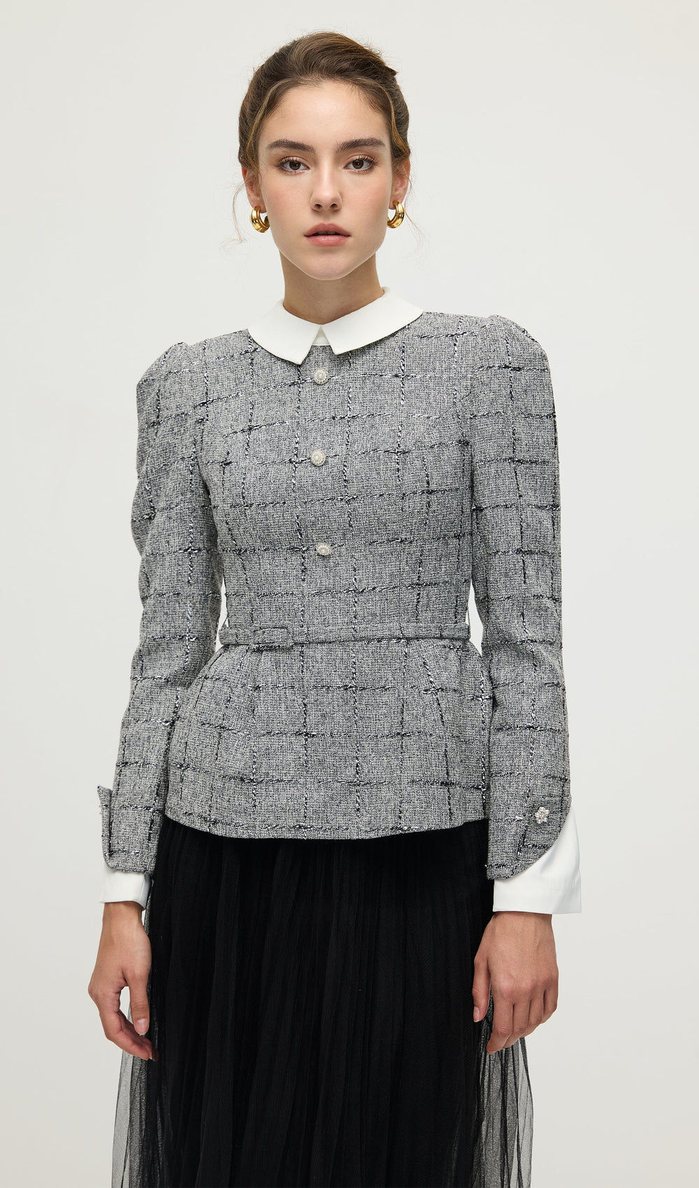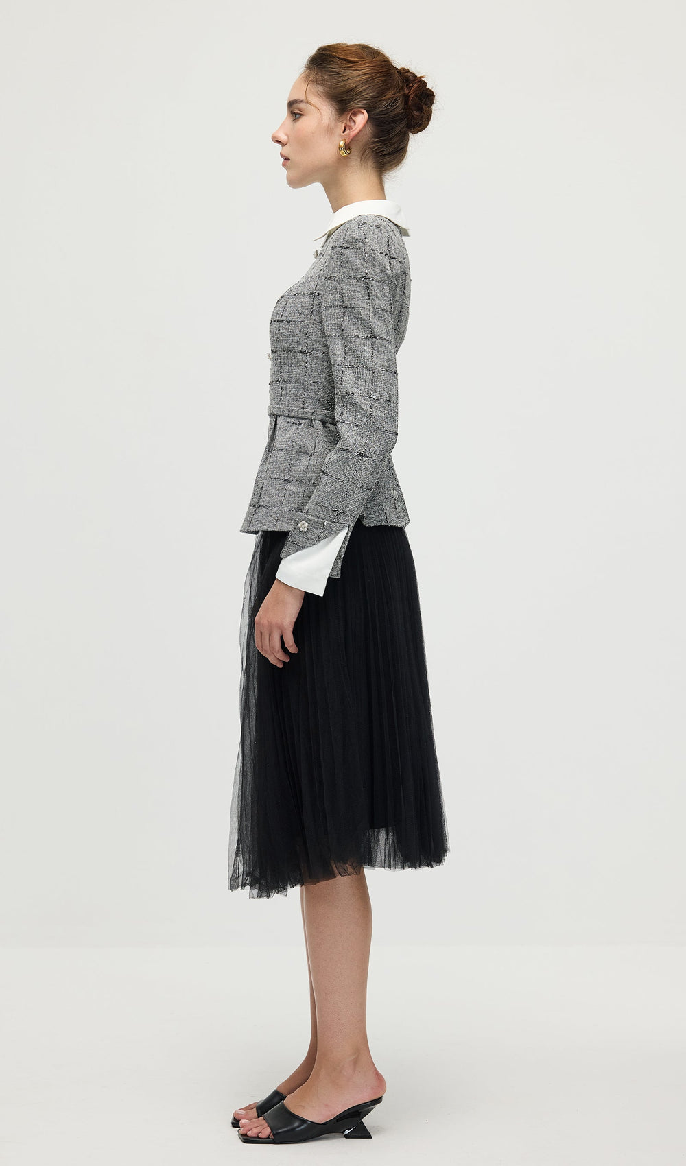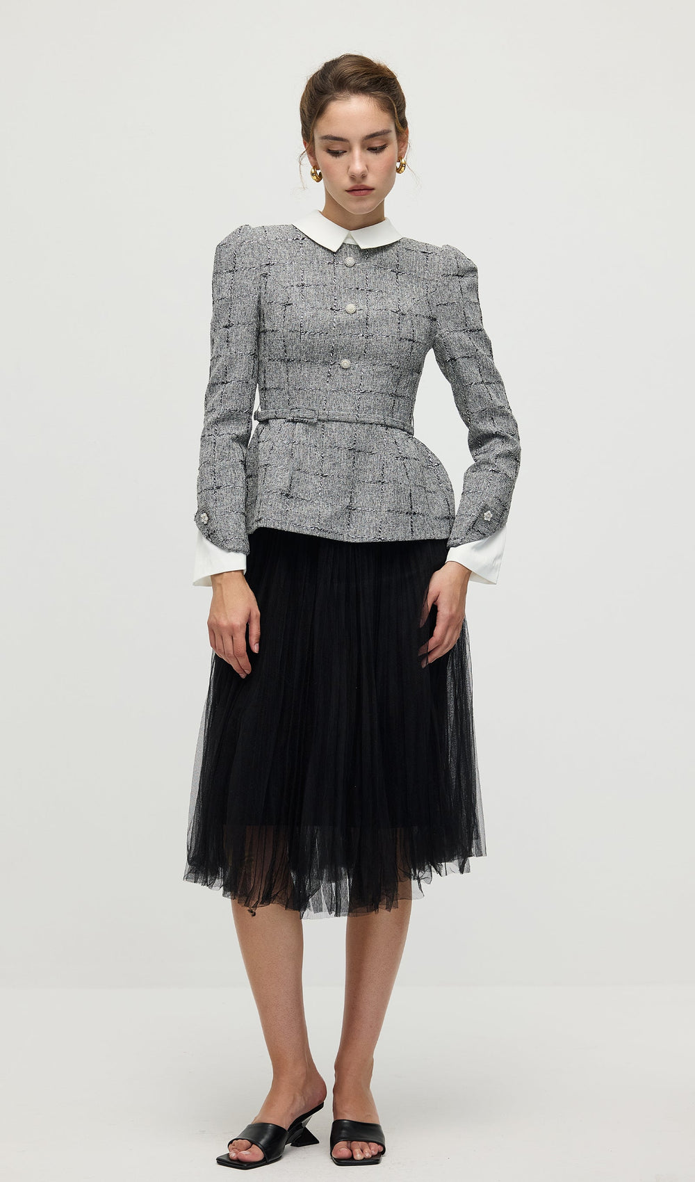 Elevate your wardrobe with this sophisticated Peplum Tweed Top & Mesh Midi Skirt Set. The structured tweed top features a flattering peplum silhouette that enhances your waistline, while the delicate mesh midi skirt adds a modern, airy contrast. Together, they create a balanced look perfect for both formal occasions and stylish everyday wear. Crafted for both comfort and elegance, this set ensures you make a polished statement with ease.
