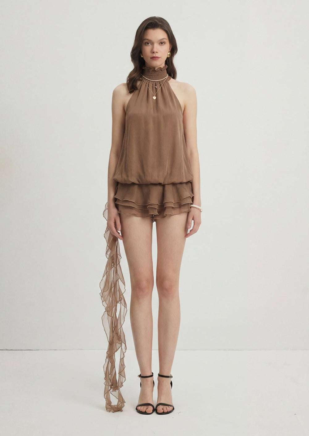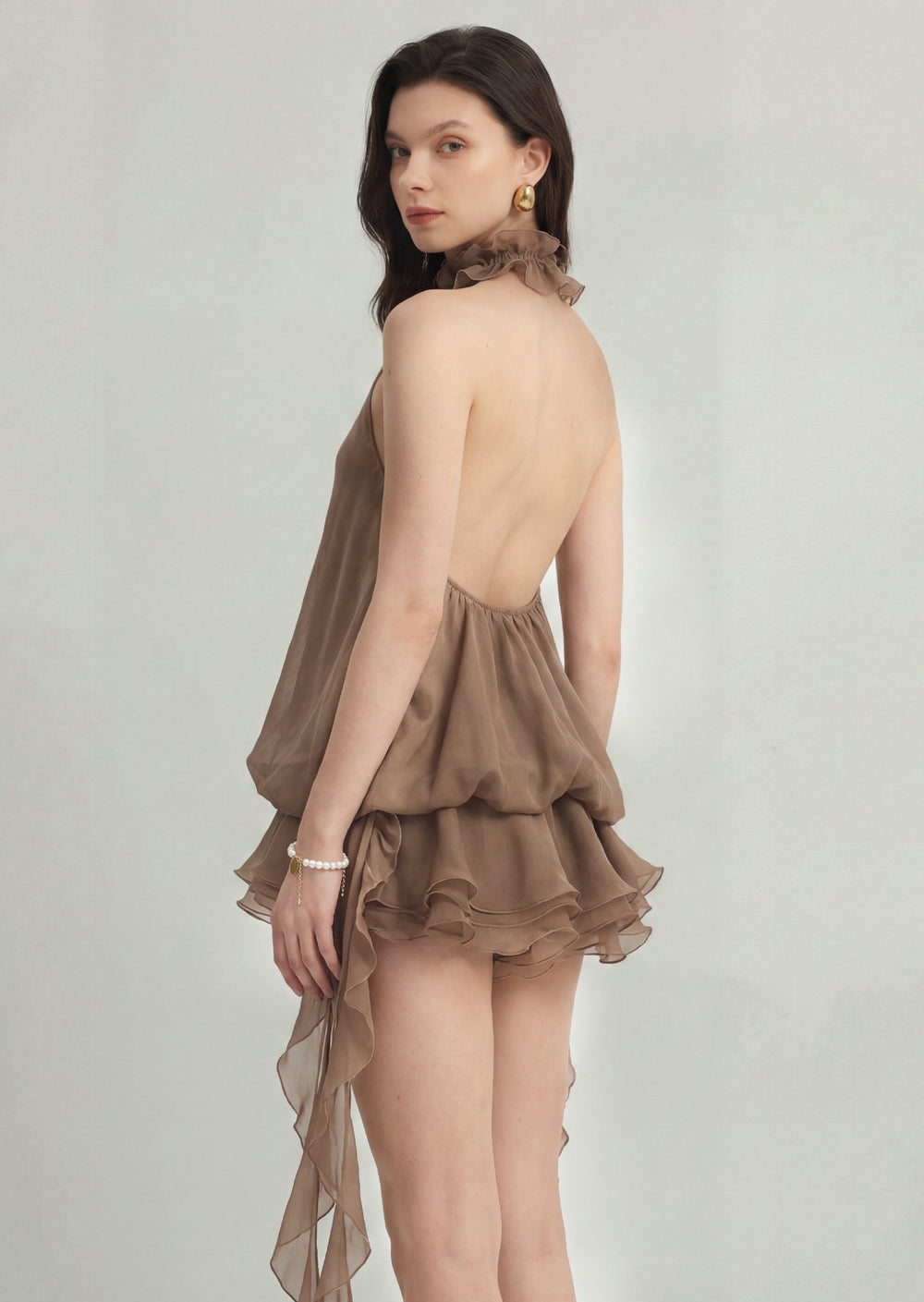 Turn heads in this striking mini dress featuring a flattering halter neckline and dramatic ruffle detailing. The irregular hemline creates an avant-garde silhouette, while the daring backless design offers a bold statement. Perfect for evening events, parties, or fashion-forward occasions where you want to make an unforgettable impression. The structured halter provides support while maintaining the dress's contemporary edge. An ideal choice for those seeking sophisticated style with modern flair.