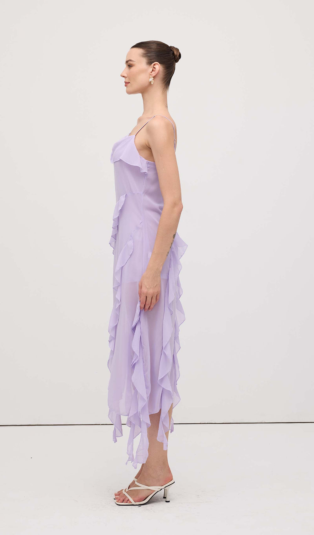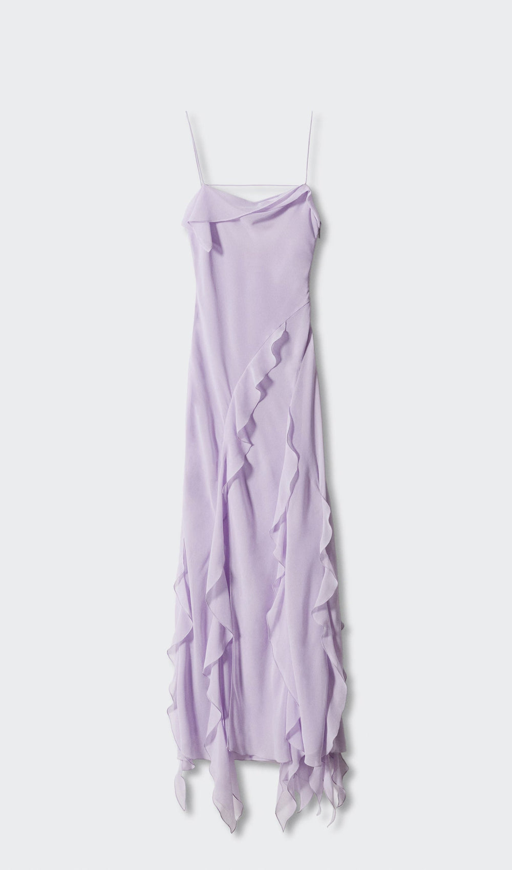 Expertly designed, our Ruffled Detail Maxi Dress features a flowy and sheer fabric for a flattering fit. With a draped neck, thin straps, and side zip fastening, this straight and long design is completed with elegant ruffle details. Perfect for any occasion, add a touch of sophistication to your wardrobe.