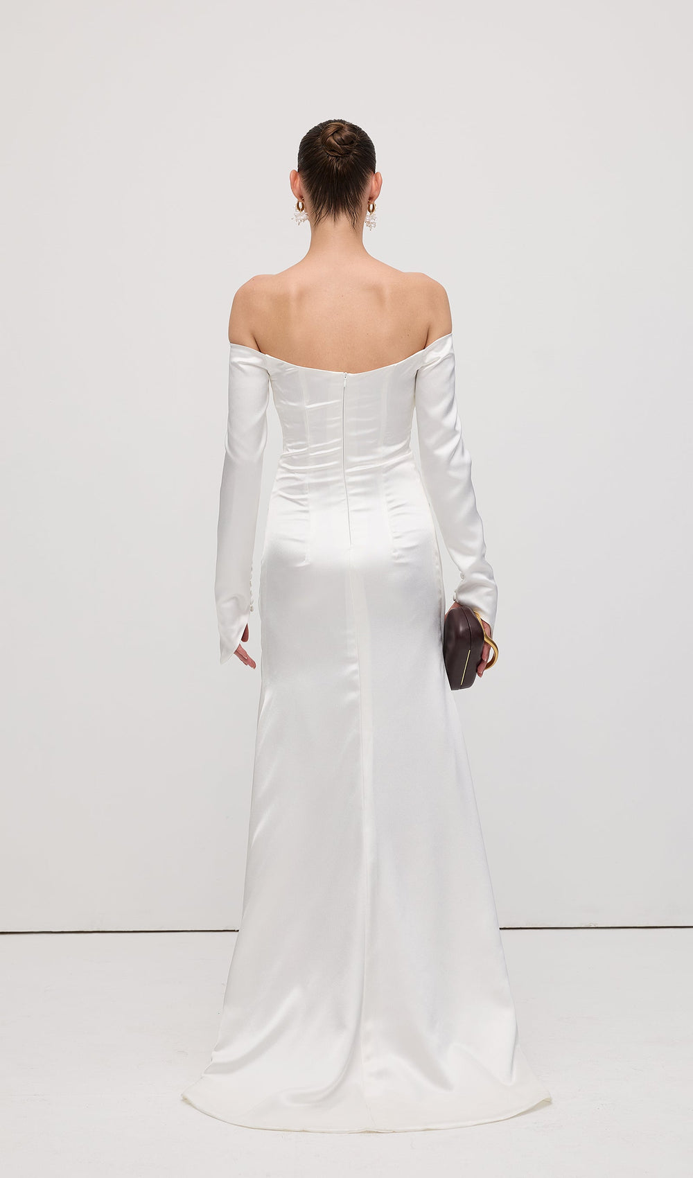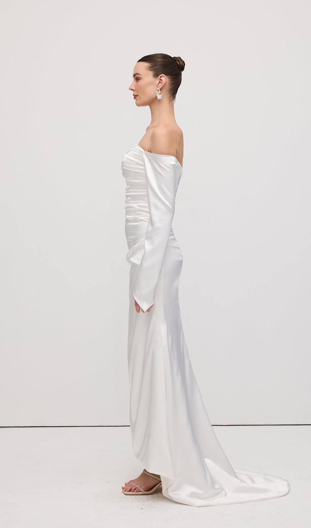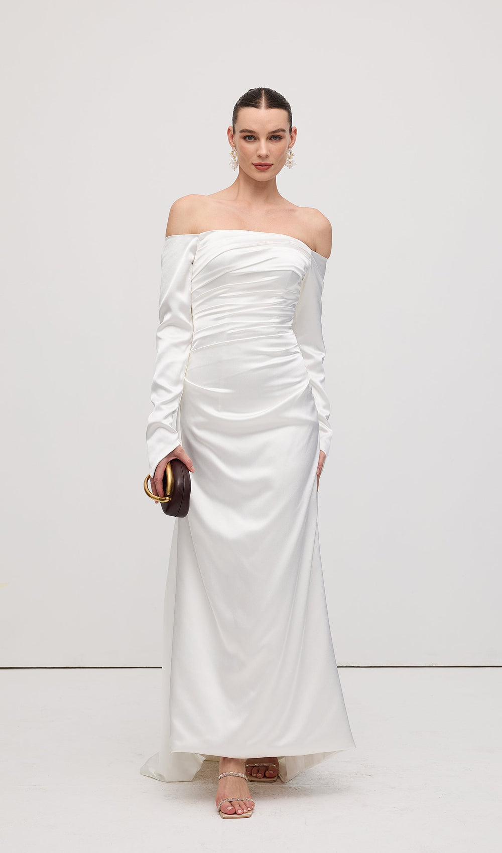 This Satin Off Shoulder Ruched Maxi Dress is the perfect combination of elegance and comfort. Made with luxurious satin fabric, the off shoulder design and ruched details add a touch of sophistication. Ideal for any special occasion, this dress will make you feel confident and stylish.