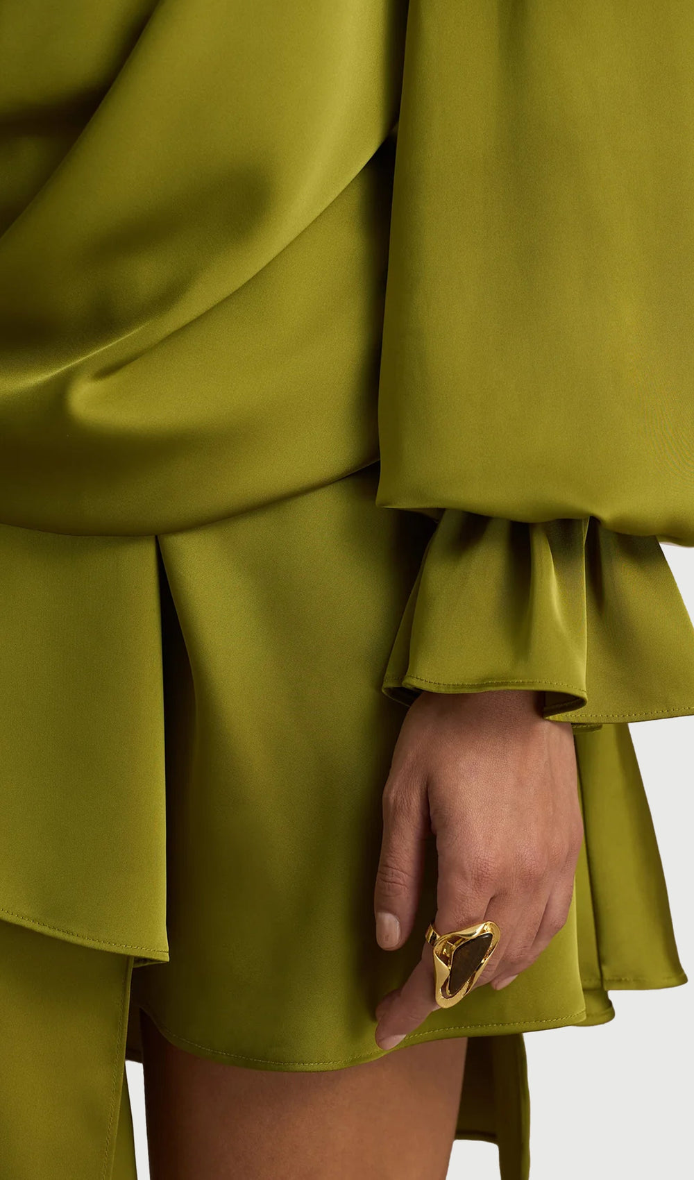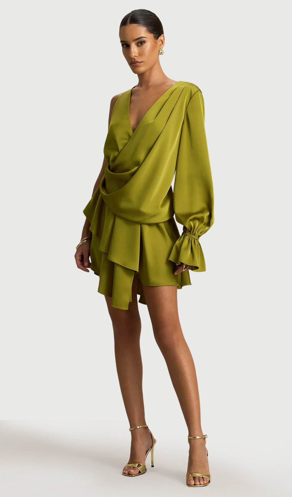 Crafted from our olive premium stretch satin, that skims over your curves graciously, this micro mini is made for the spotlight. Featuring a daring plunge neckline and a statement long sleeve with a frilled cuff, it is the definition of sultry sophistication. The asymmetric layered skirt with tiered ruffles adds that extra drama, creating movement with every step. Perfect for parties, sunset cocktails or any moment worth remembering.