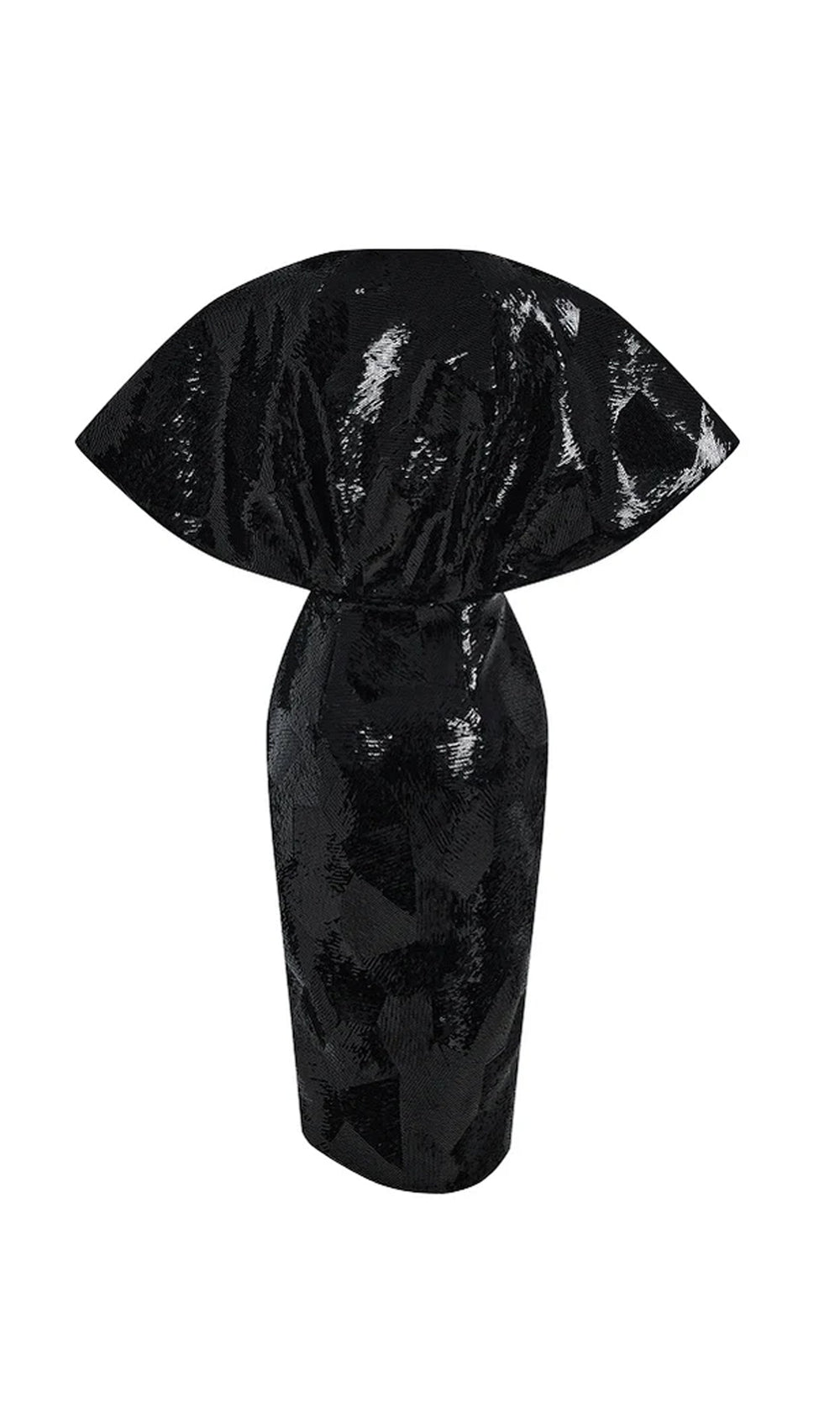A midi dress with a V-shaped neckline and voluminous sleeves, fully embellished with sequins that shimmer with movement. A delicate pleat at the waist adds definition and highlights the silhouette. The asymmetric hem completes the striking composition.