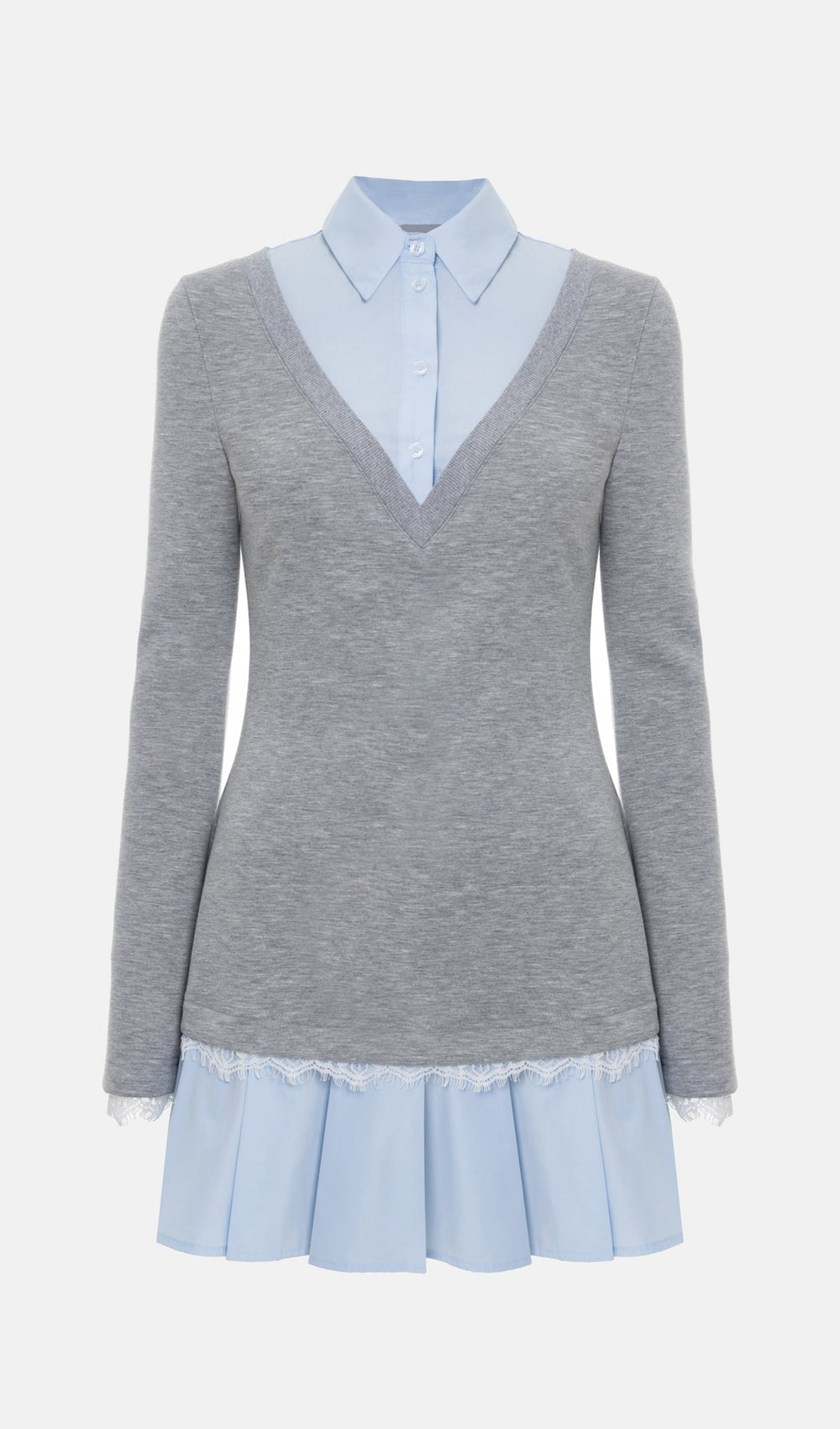 Mini dress of semi-fitted silhouette, made from a combination of two materials in business style. The dress has a shirt collar and a playful pleated skirt, made from dense cotton, as well as a knitted sweater with long sleeves and lace decor on the cuffs and bottom edge.