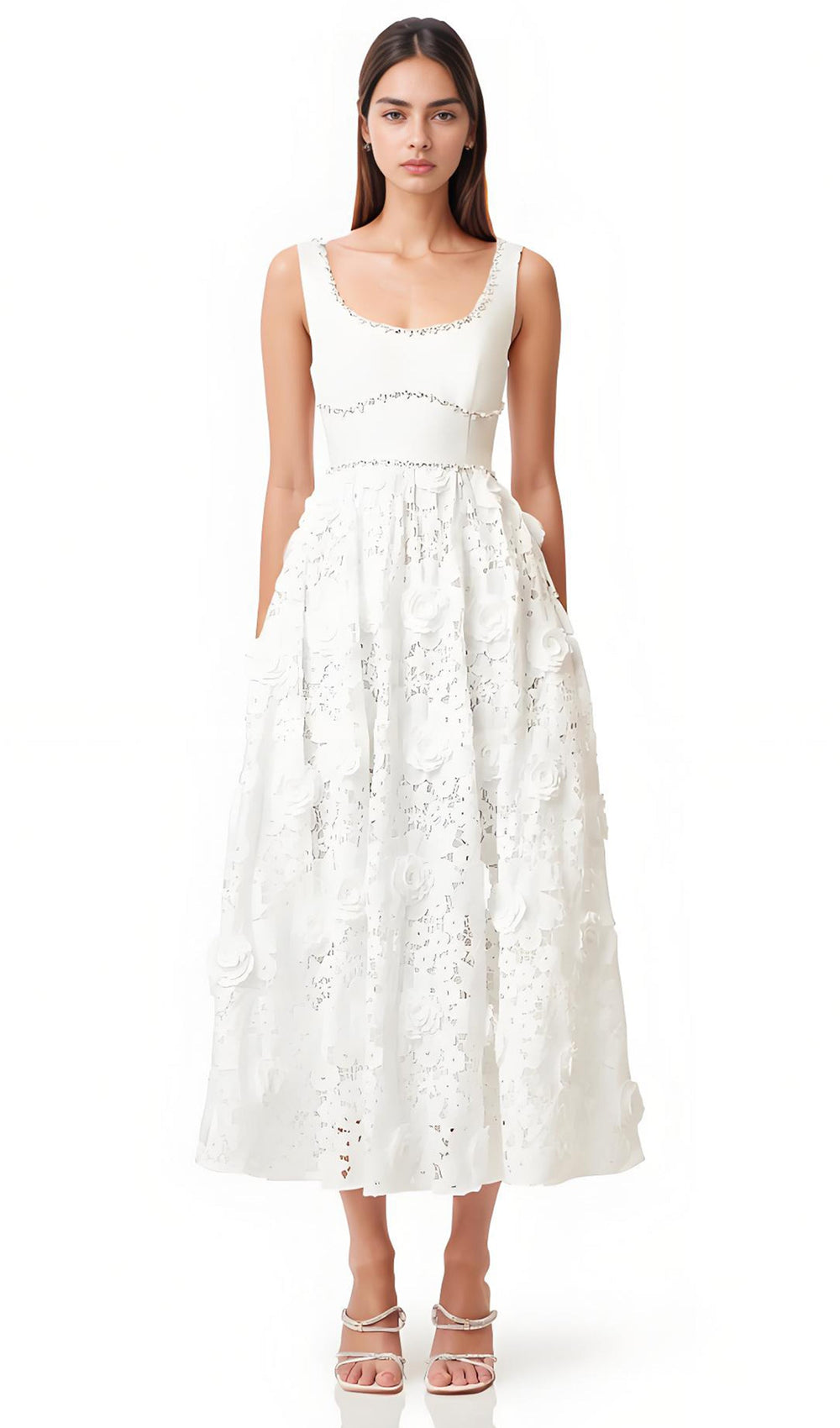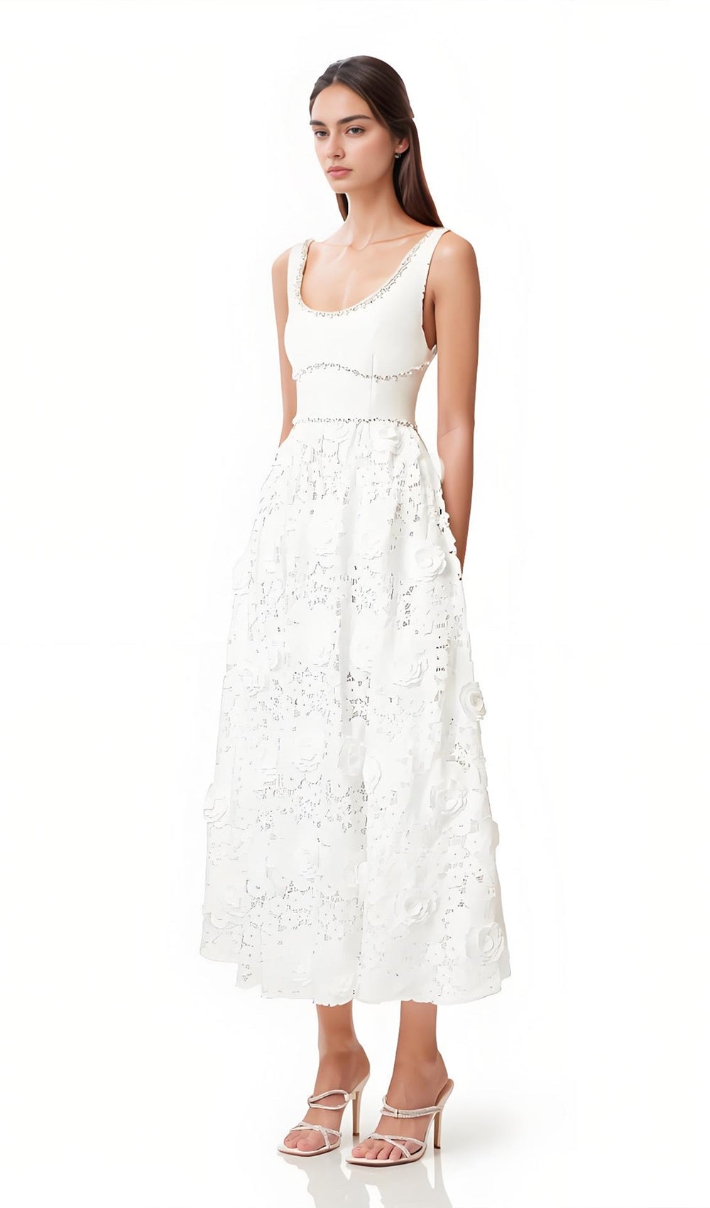 This sleeveless embellished lace midi dress combines intricate lace detailing with subtle embellishments for an elegant, sophisticated look. Its midi length offers versatility for both formal occasions and stylish daytime events. The sleeveless design enhances comfort and breathability, making it a refined choice for warm weather or layered styling. Perfect for those seeking timeless elegance with expert craftsmanship.