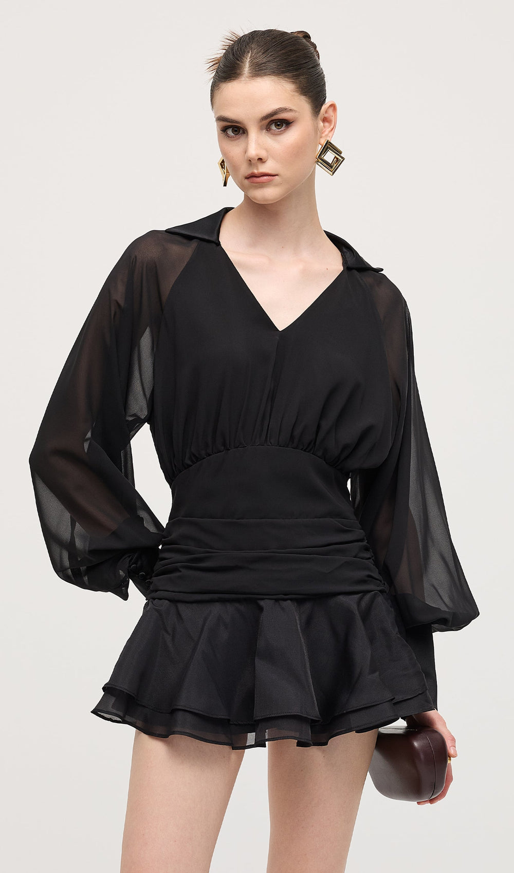 This Solid Lantern Sleeve Mini Dress is a must-have for any fashion-forward wardrobe. The chic lantern sleeves add a touch of drama and sophistication, while the high-quality fabric provides a comfortable, flattering fit.The neckline and cuff expertly crafted from luxurious 100% silk. Perfect for any occasion, this dress is a versatile and stylish addition to your closet.