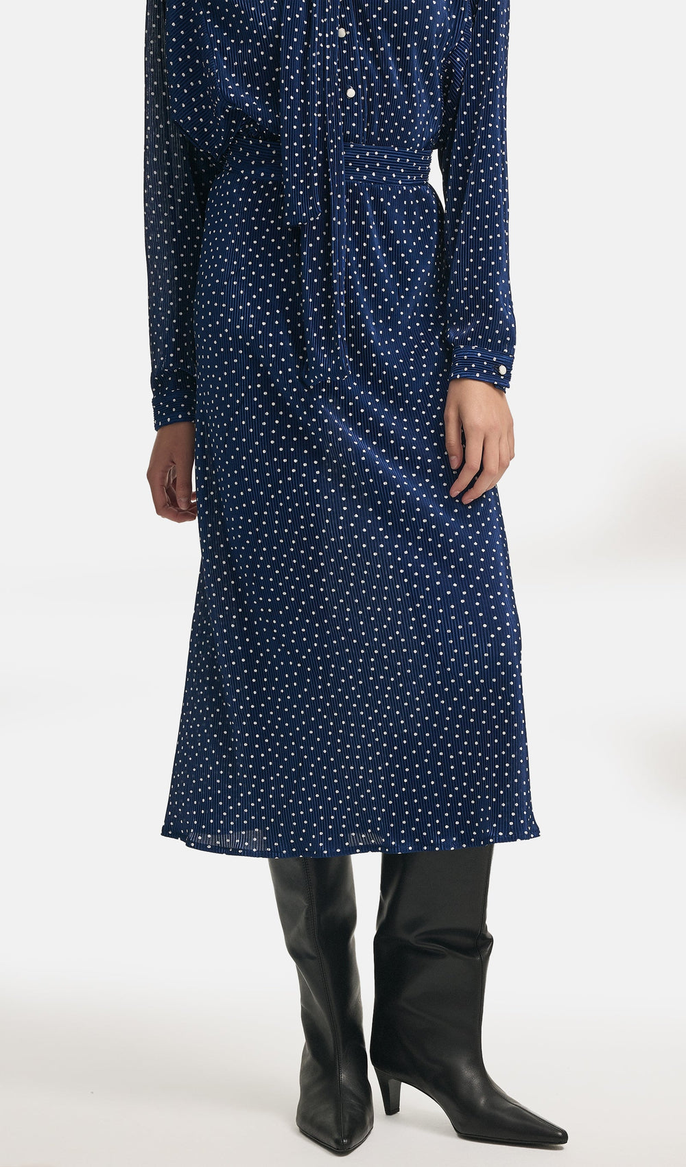 A fluid maxi skirt in pleated satin with a delicate polka-dot pattern. Designed to move with ease, it drapes gracefully around the body, capturing light with every step. The clean waistband and understated silhouette bring a sense of modern poise, an effortless balance of softness and structure.